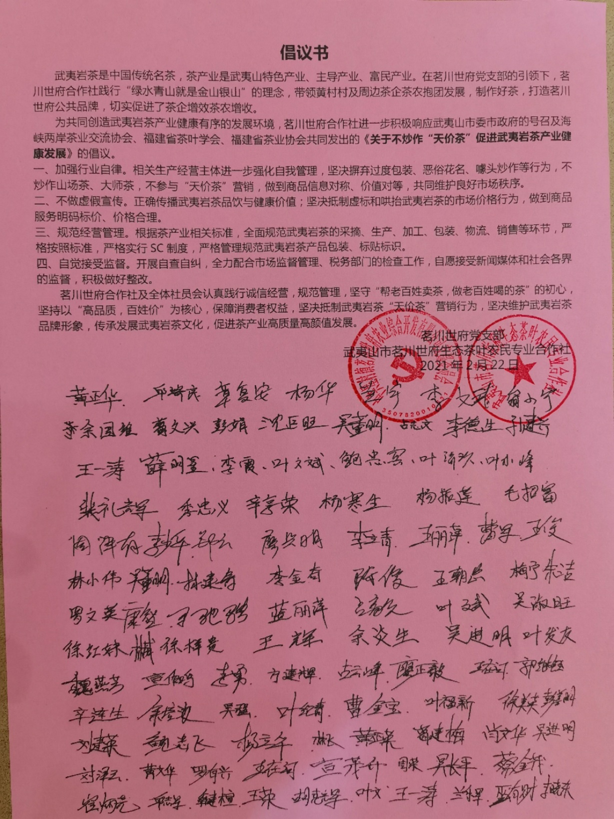武夷山茶业同业公会发出公开信,并组织26家“天价茶”榜单上的茶企负责人签署倡议书,带头抵制“天价茶”乱象。海峡两岸茶业交流协会、福建省茶叶学会和福建省茶业协会则共同发出倡议书,呼吁加强行业自律,规范经营管理,进一步促进武夷岩茶市场的健康稳定有序发展,更好地维护福建茶产业的整体形象。