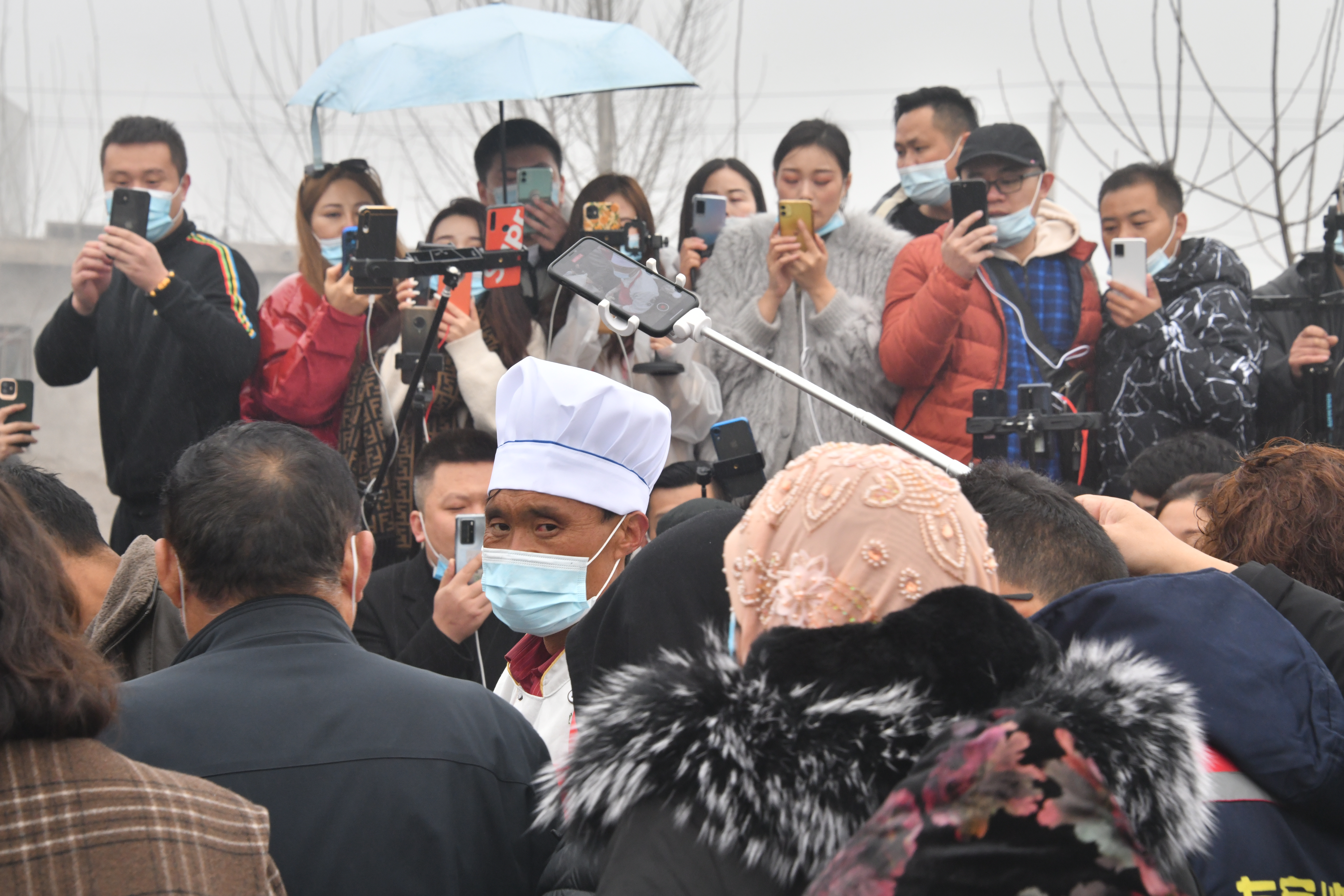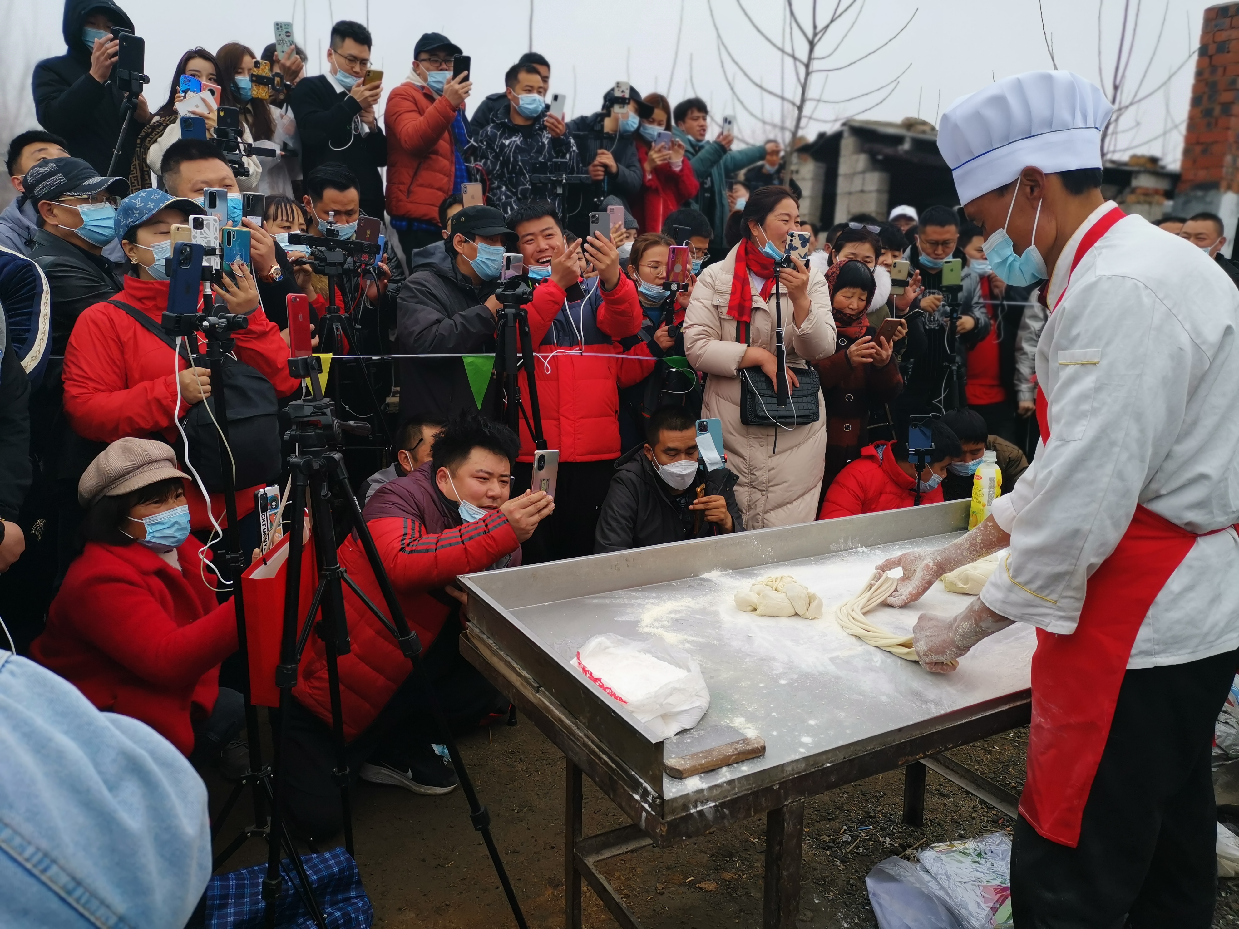 2月28日,众多网红和视频博主将费县梁邱东大集上程运付的拉面摊围得水泄不通。新华社记者贾云鹏摄