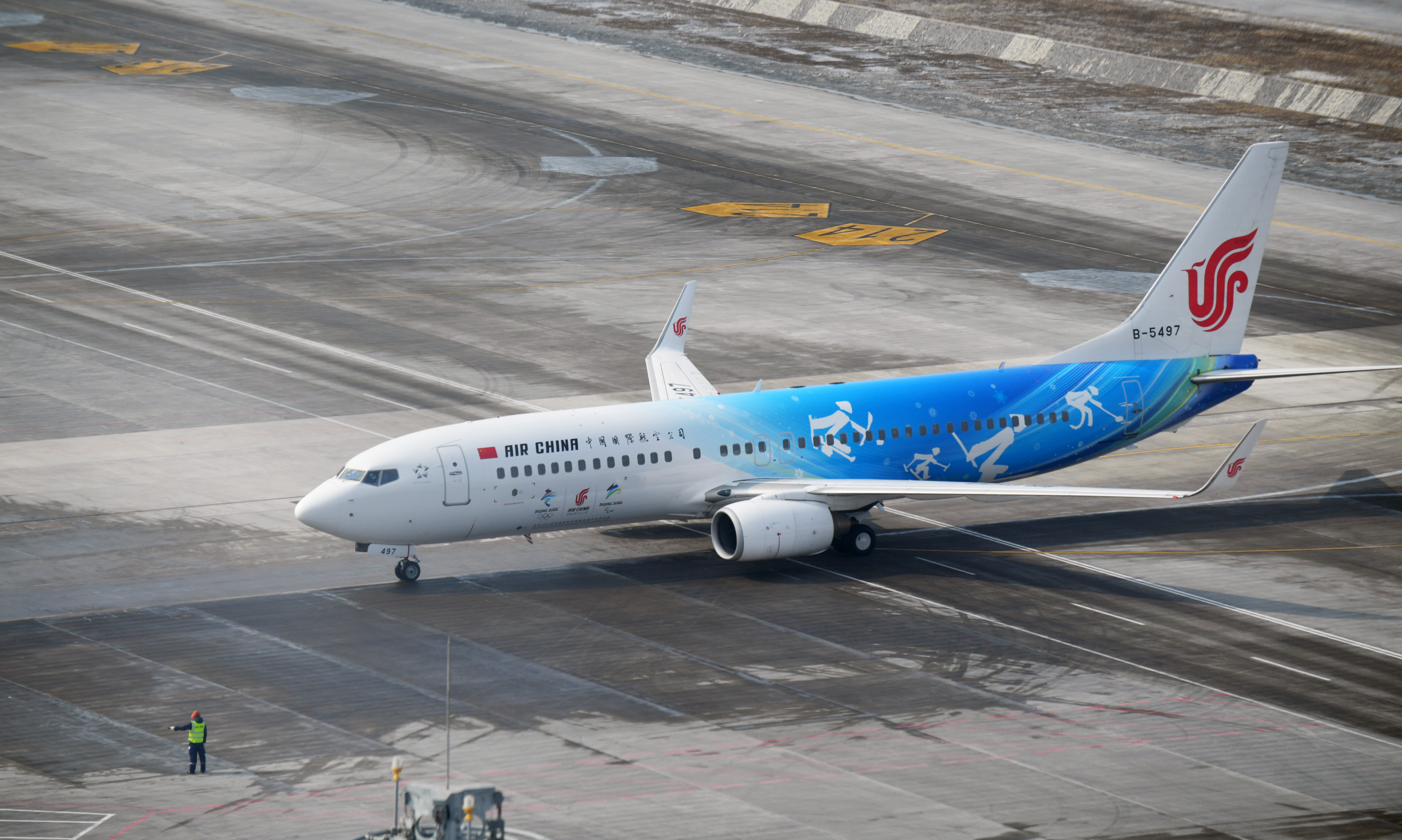 3月4日,冬奥主题彩绘飞机“冬奥运动号”飞抵长春龙嘉国际机场。新华社记者 林宏摄