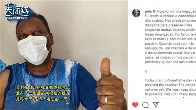 除了各国政要,巴西著名足球运动员贝利当地时间3月2日,在家乡接种了由中国研制的新冠疫苗。贝利在自己的社交媒体账号上发布了一张竖起大拇指的照片,并称今天“是令人难忘的一天”。