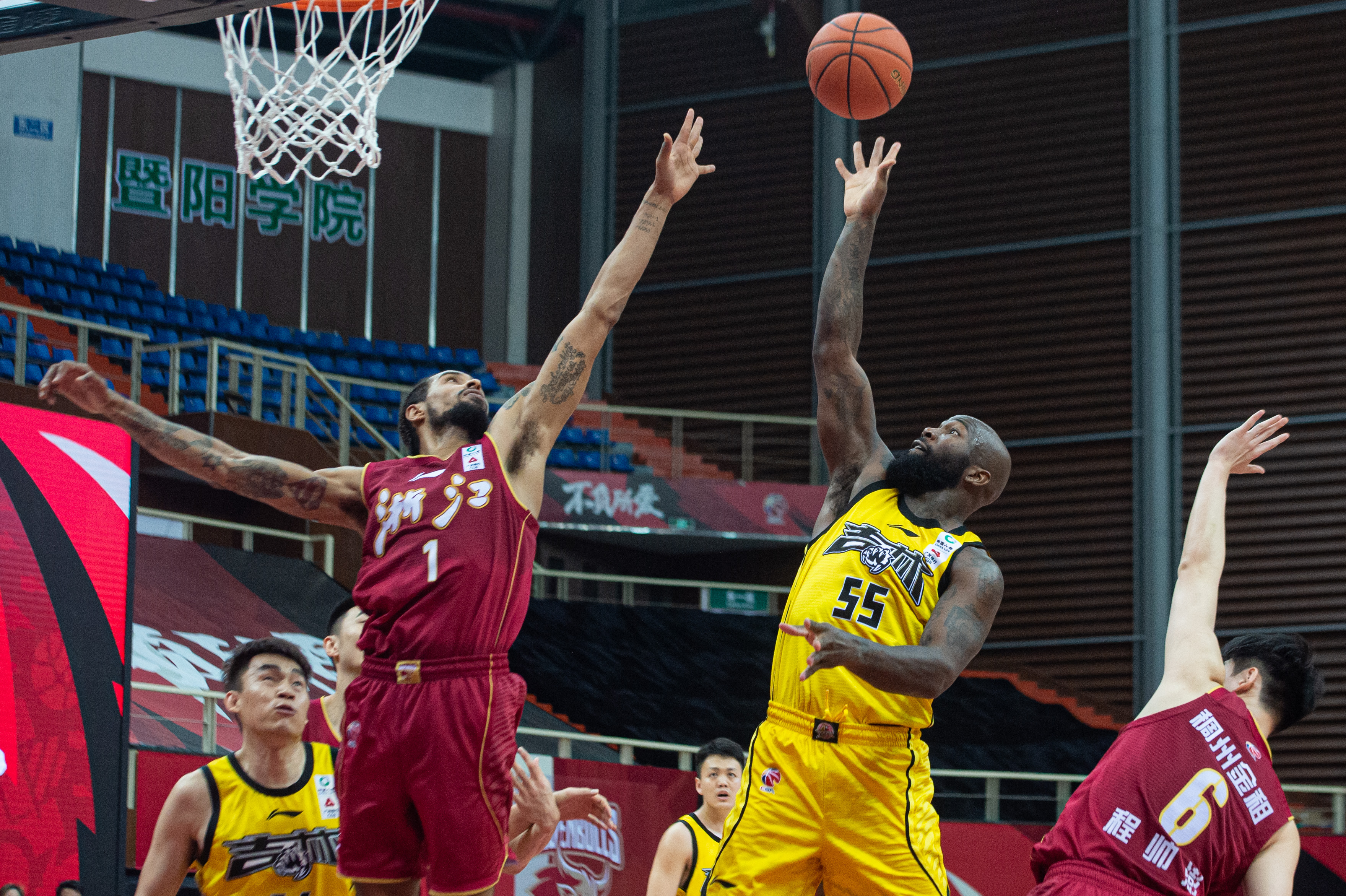 3月4日,吉林队球员琼斯(上右)在浙江队球员兰兹博格(上左)的防守下投篮。新华社记者江汉摄