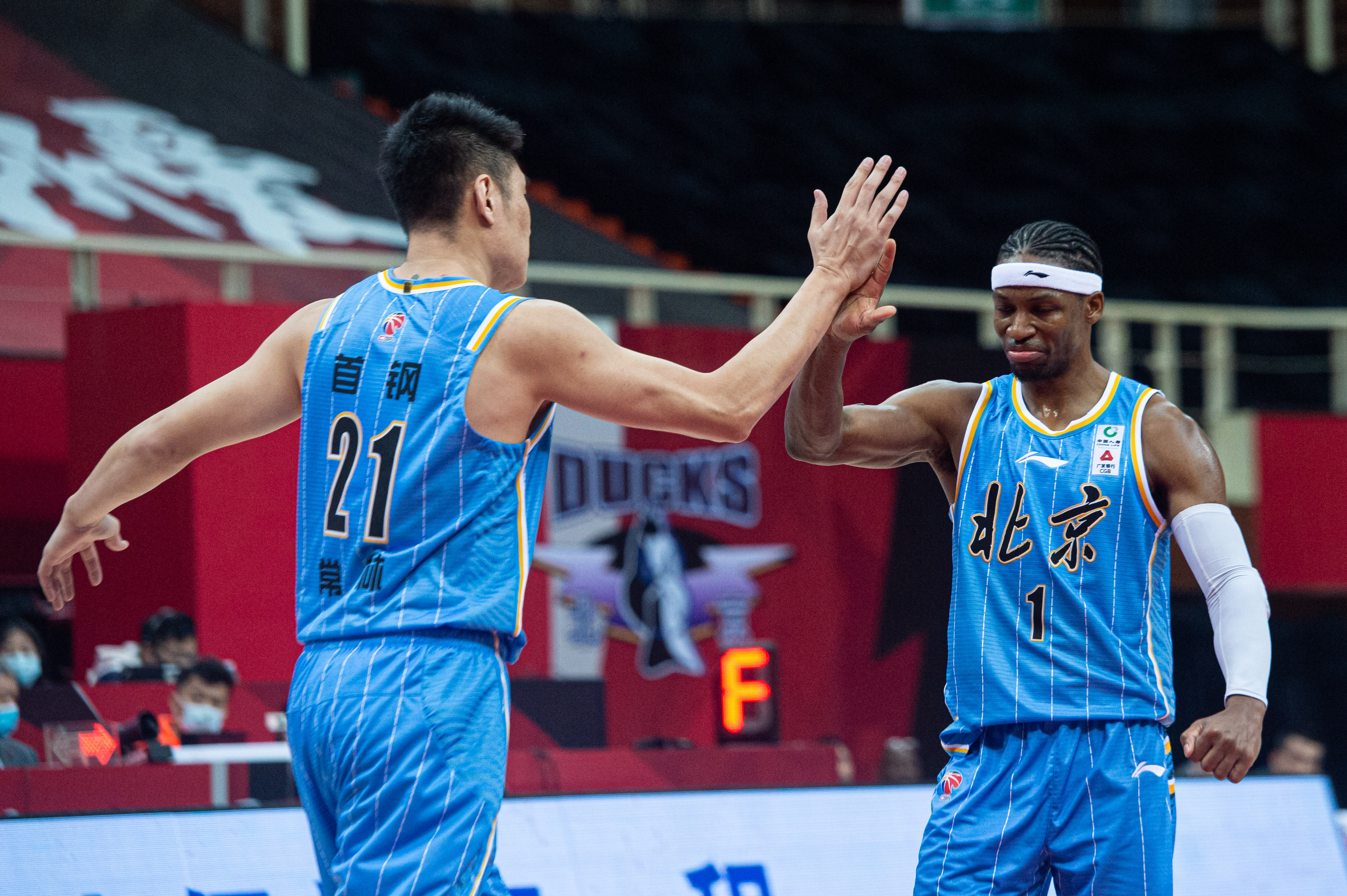 北京队球员常林(左)在比赛中进攻得手并获得加罚后与队友吉布森击掌庆祝。新华社记者江汉摄
