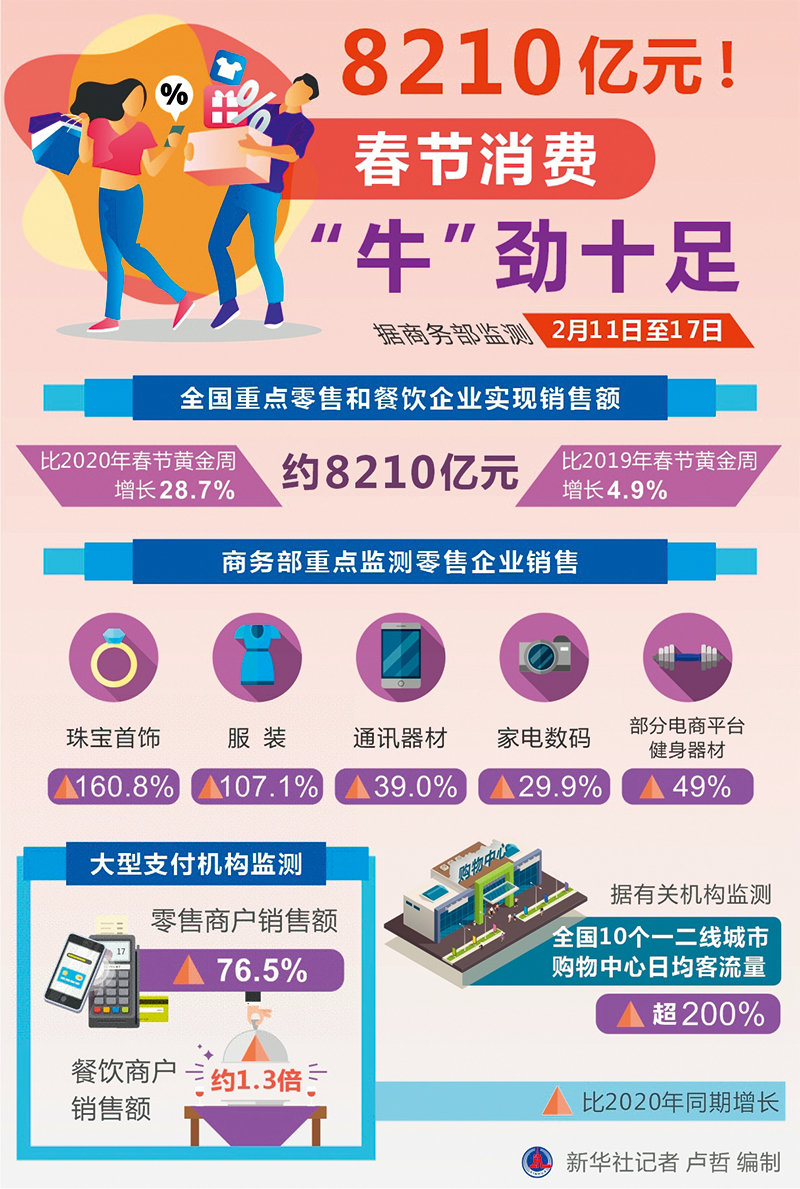 春节,往往是观察中国消费和经济活力的重要窗口。最近,中国春节消费“账单”刷了屏:零售和餐饮消费超8200亿元,网络零售额超1200亿元,快递突破6.6亿件,电影票房突破78亿元……一个个数据刷新纪录,时间只用了一周。