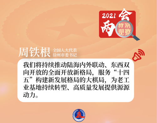 “我们将持续推动陆海内外联动、东西双向开放的全面开放新格局,服务‘十四五’构建新发展格局的大棋局,为老工业基地持续转型、高质量发展提供源源动力。”全国人大代表、徐州市委书记周铁根说。
