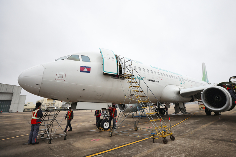 在海口美兰机场,工作人员对柬埔寨澜湄航空的空客A320飞机进行定检工作。新华社记者 张丽芸 摄