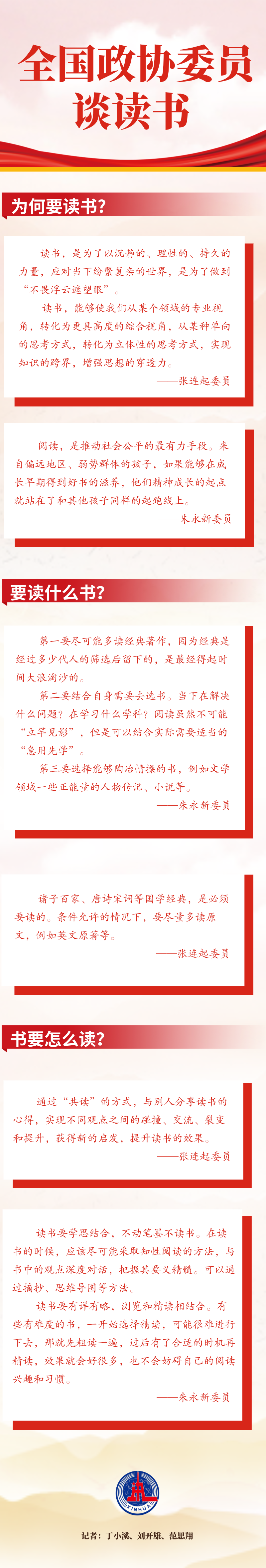 政协委员多饱学之士。他们是如何读书的? 这里,我们邀请了全国政协常委、民进中央副主席朱永新,全国政协常委、经济学家张连起两位“学霸”委员,为爱读书的你指点迷津。欲知详情,请看大图——