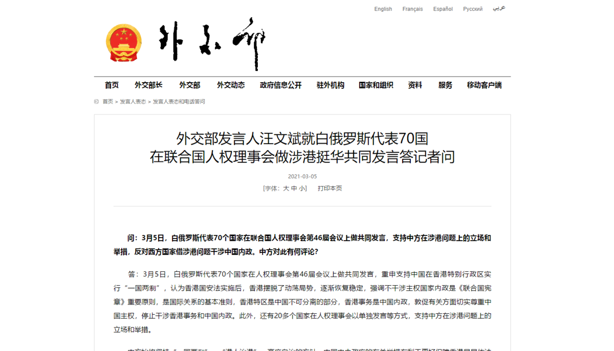 答:3月5日,白俄罗斯代表70个国家在人权理事会第46届会议上做共同发言,重申支持中国在香港特别行政区实行“一国两制”,认为香港国安法实施后,香港摆脱了动荡局势,逐渐恢复稳定,强调不干涉主权国家内政是《联合国宪章》重要原则,是国际关系的基本准则,香港特区是中国不可分离的部分,香港事务是中国内政,敦促有关方面切实尊重中国主权,停止干涉香港事务和中国内政。此外,还有20多个国家在人权理事会以单独发言等方式,支持中方在涉港问题上的立场和举措。
