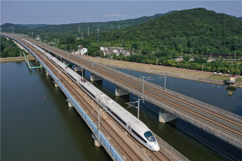 一列和谐号动车组列车驶经京沪高速铁路南京段(无人机照片,2020年6月30日摄)。新华社发(方东旭 摄)