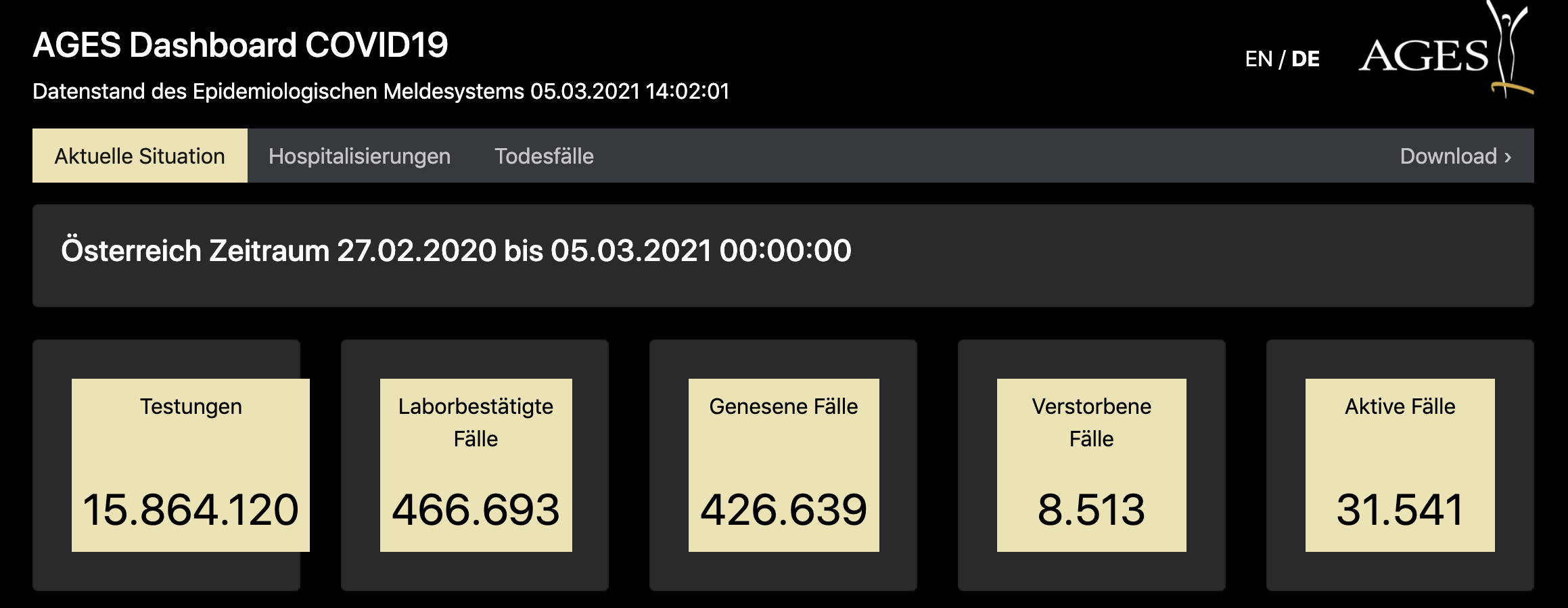 奥地利卫生部最新数据显示,截至当地时间3月5日14时2分(即北京时间3月5日21时2分),奥地利新增新冠肺炎确诊病例2319例,累计确诊466693例;新增死亡24例,累计死亡8513例;累计治愈426639例。截至目前,共有1444名新冠肺炎患者在医院接受治疗,其中有302名患者在重症监护室。