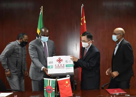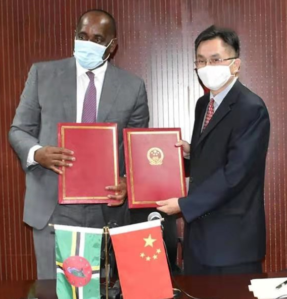 △斯凯里特和罗松涛交接疫苗(图片由驻多米尼克使馆提供)