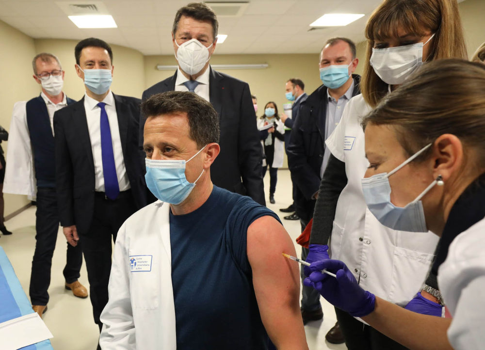 1月5日,在法国南部城市尼斯的一家医院里,一名医护人员接受新冠疫苗接种。(新华社发,塞尔日·阿乌齐摄)