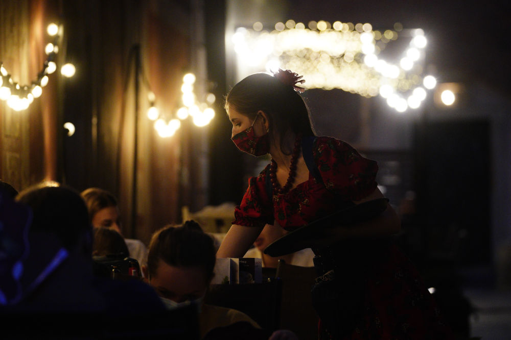 2020年9月24日,一名女侍者在波兰首都华沙一家餐馆内戴着口罩服务顾客。(新华社发,亚普·阿里恩斯摄)
