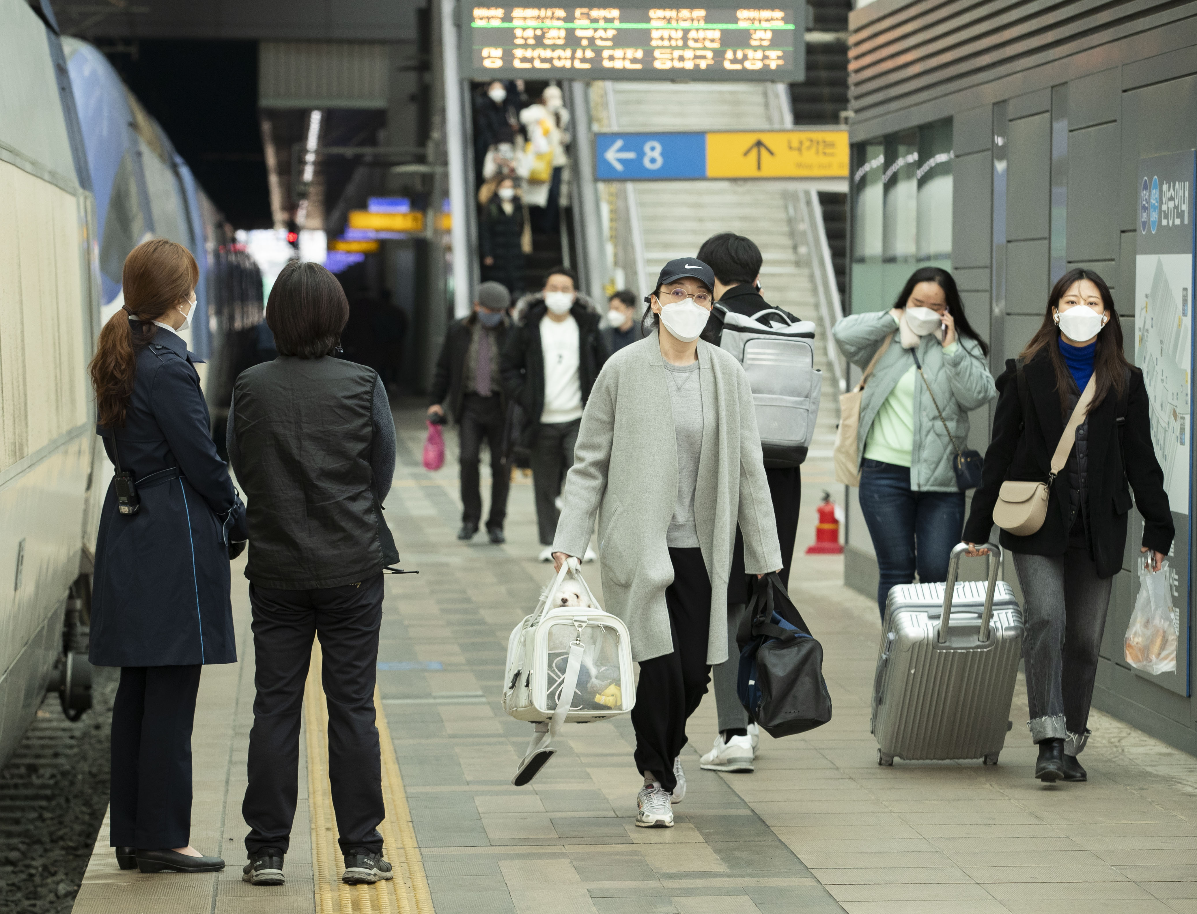 2月10日,戴口罩的乘客在韩国首尔站准备坐车回家过节。(新华社发,李相浩摄)