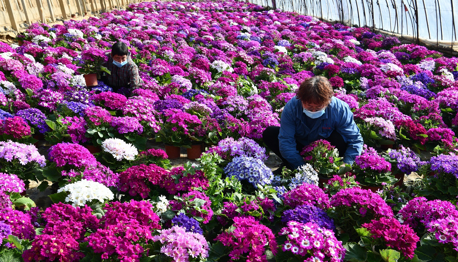 2021年2月2日,石家庄市栾城区柳林太空庄园的花农正在将花卉装袋,准备售卖。李明发 摄