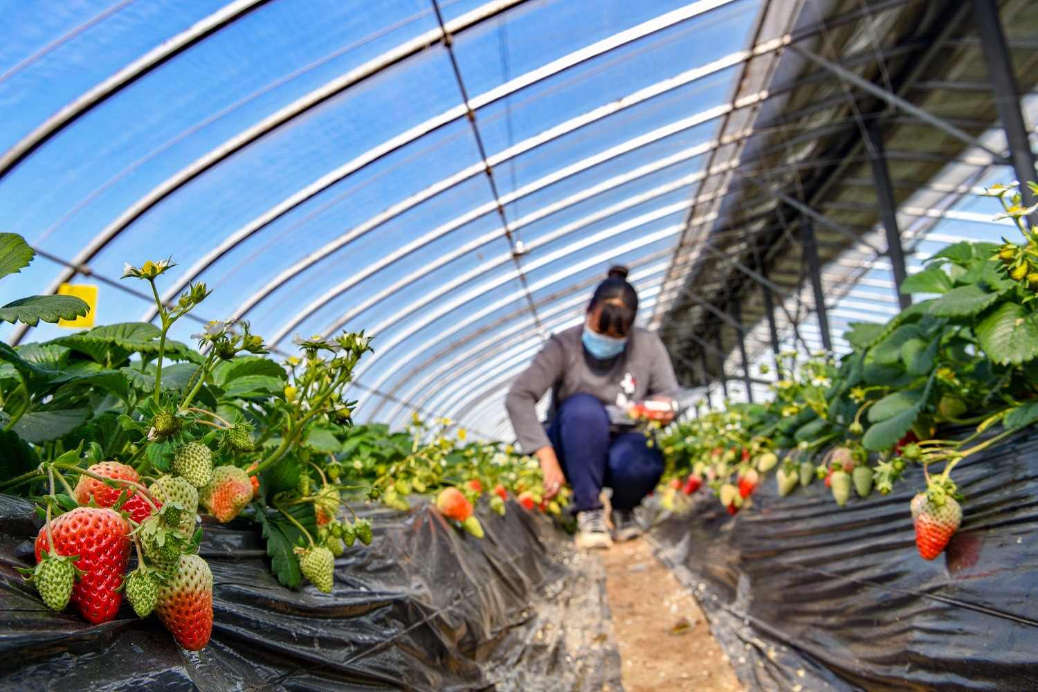 2021年2月2日,石家庄市栾城区神农福地种植专业合作社的农户正在采摘草莓。李明发 摄