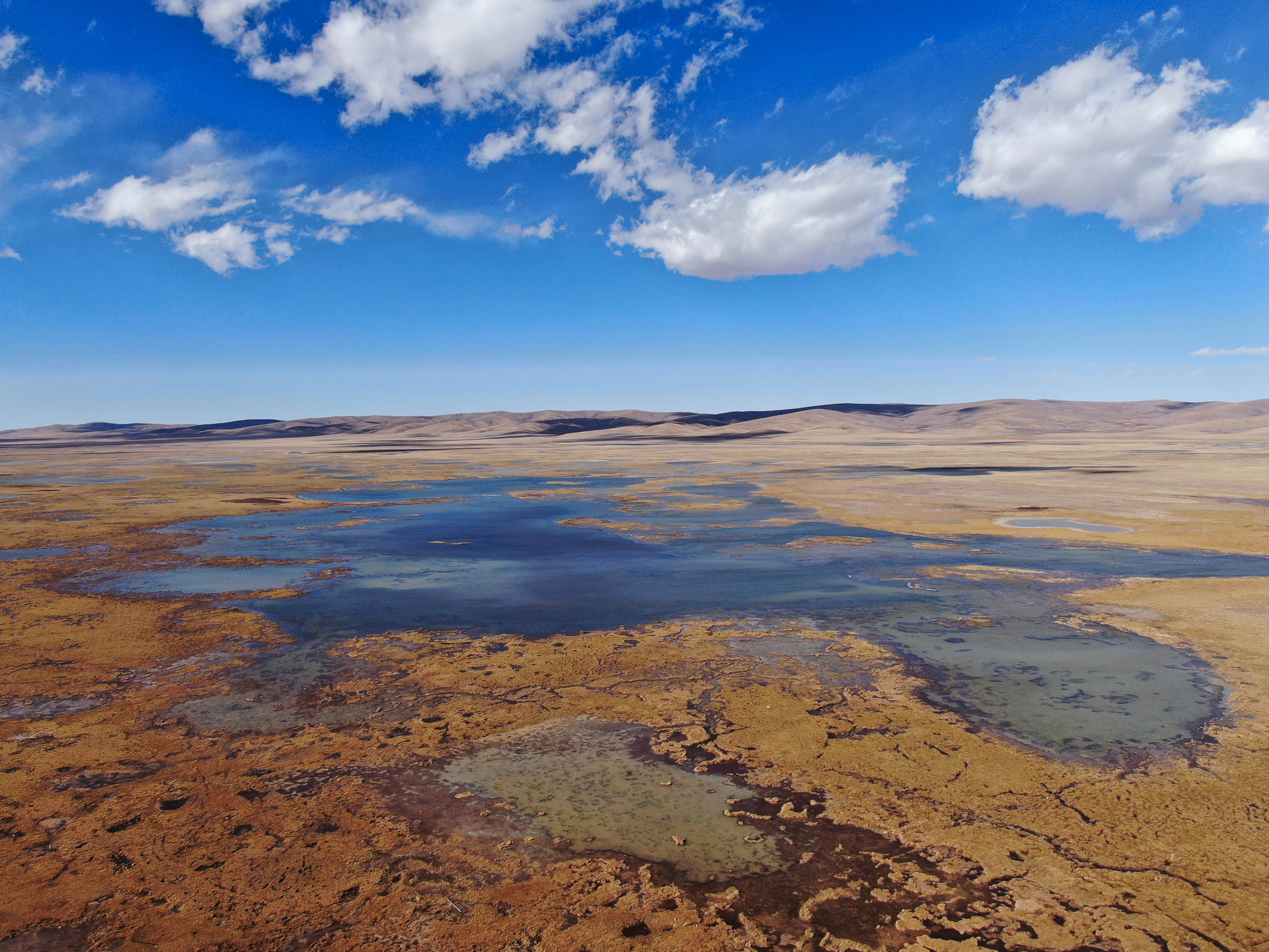 这是2020年10月30日在青海省果洛藏族自治州玛多县境内拍摄的一处湿地(无人机照片)。新华社记者 张龙 摄