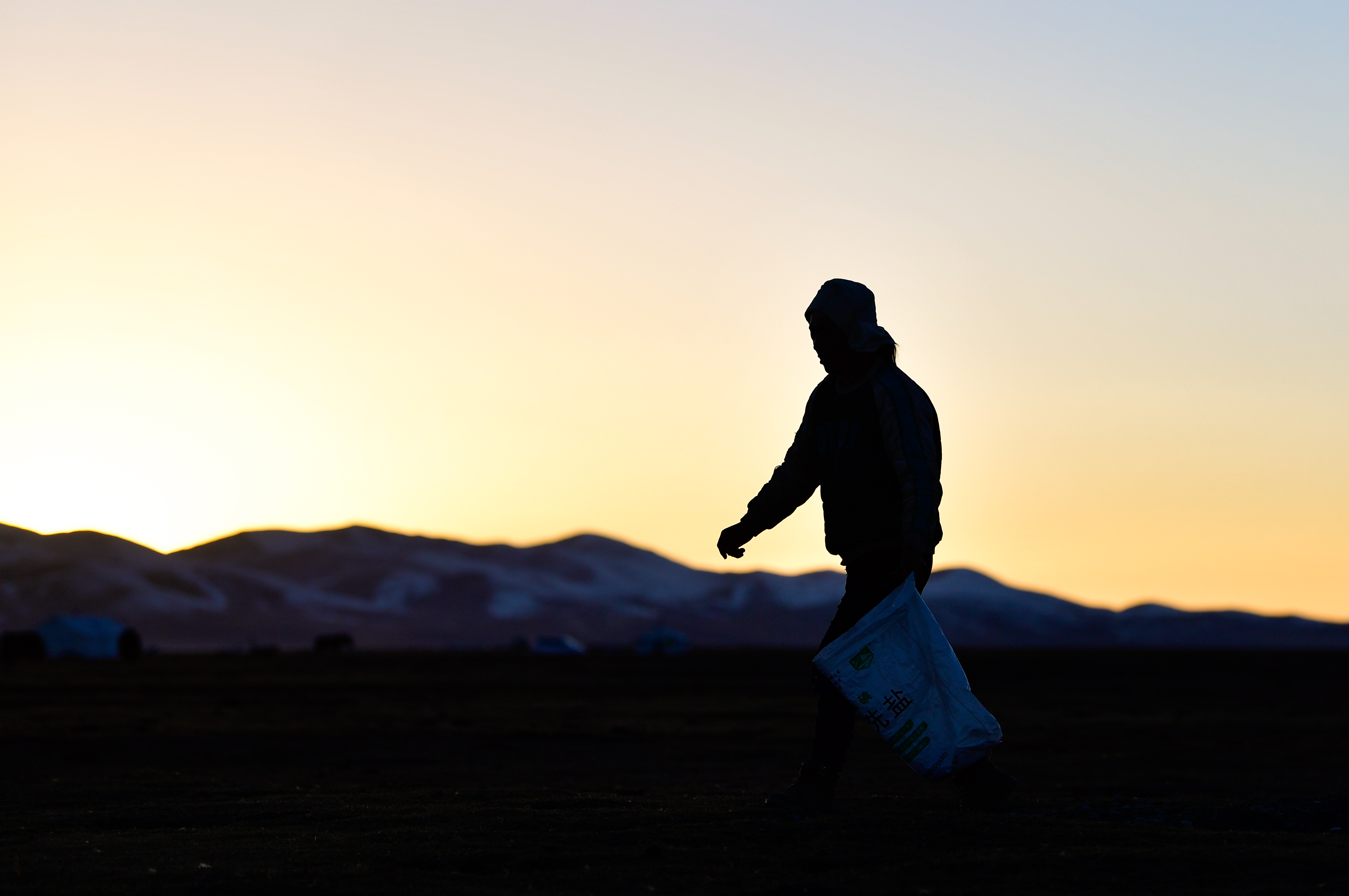 2020年10月28日,在青海省玉树藏族自治州称多县境内的嘉塘草原上,生态管护员扎西才文在捡拾垃圾。新华社记者 张龙 摄