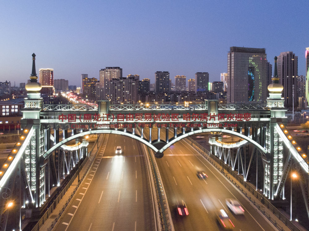 这是2020年11月13日拍摄的位于阳明滩大桥上的中国(黑龙江)自由贸易试验区哈尔滨片区“大门”(无人机照片)。(新华社发,张涛摄)