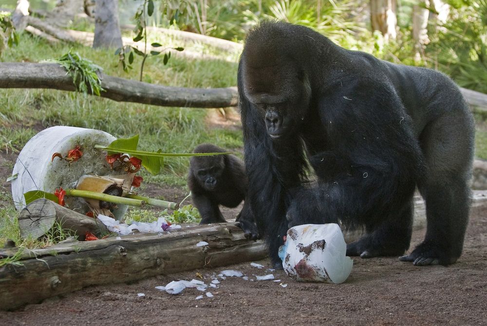 2009年9月4日,在美国圣迭戈动物园,大猩猩保罗·多恩(右)与小猩猩弗兰克注视着一只被它们打坏的生日蛋糕。(新华社/路透)