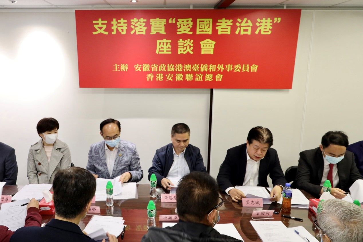 3月5日下午,由安徽省政协港澳台侨和外事委员会、香港安徽联谊总会联合主办的支持落实“爱国者治港”座谈会在联谊总会会址召开。座谈会上,安徽省政协常委、香港安徽联谊总会常务副会长朱浴龙强调,“爱国者治港”的目的就是为了让“一国两制”能够健康地、成功地实践,令“一国两制”行稳致远。(总台记者 金东 周伟琪 冯良辰 李志强 苏子杰 叶丽丽)