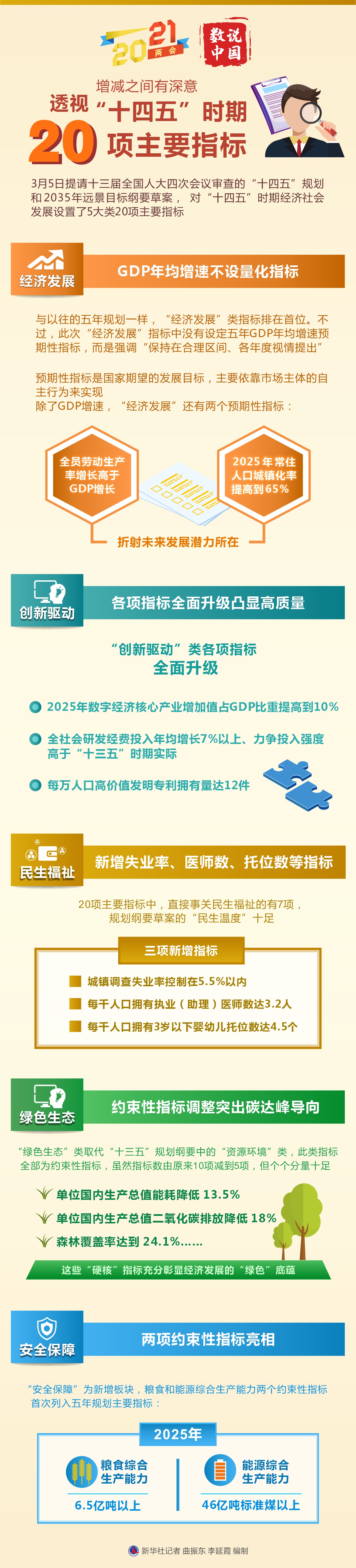 5日提请十三届全国人大四次会议审查的“十四五”规划和2035年远景目标纲要草案,对“十四五”时期经济社会发展设置了5大类20项主要指标。与“十三五”规划相比,有新增的指标,有删减的指标,也有提法发生变化的。