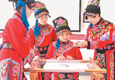 2021年3月1日,陕西省汉中市宁强县羌绣传承人王小琴(右一)正在与绣娘交流羌绣针法及图案等技艺。吴天文摄(人民图片)