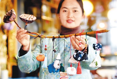 2021年2月25日,江苏省扬州市邗江区方巷镇沿湖村“渔三代”渔娘潘兰兰变身为时尚创客,正在展示蕴含渔村生态元素的挂件文创作品。庄文斌摄(人民图片)