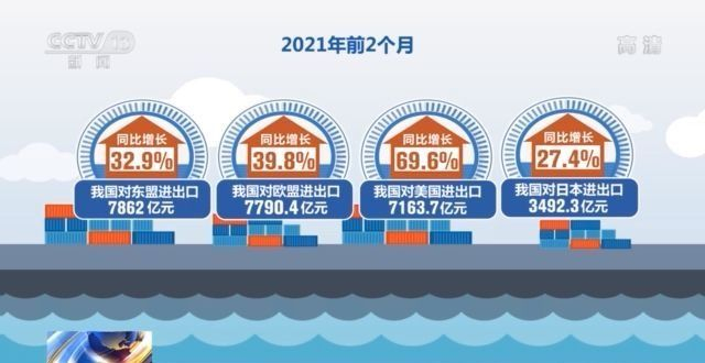 据海关统计,今年前2个月,我国对东盟、欧盟、美国、日本分别进出口7862亿元、7790.4亿元、7163.7亿元和3492.3亿元,同比分别增长32.9%、39.8%、69.6%和27.4%。其中,东盟为我国第一大贸易伙伴,占我国外贸总值的14.4%。