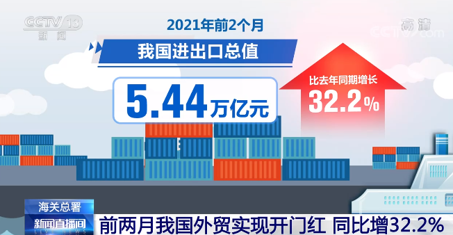 央视网消息:今天(7日)上午,海关总署公布了今年前两个月外贸进出口相关情况。数据显示,前两个月我国进出口总值5.44万亿元,比去年同期增长32.2%,进出口继续保持向好势头。