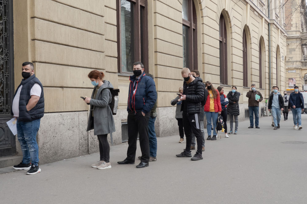 3月4日,在匈牙利首都布达佩斯,人们佩戴口罩在邮局门前排队。(新华社发,弗尔季·奥蒂洛摄)