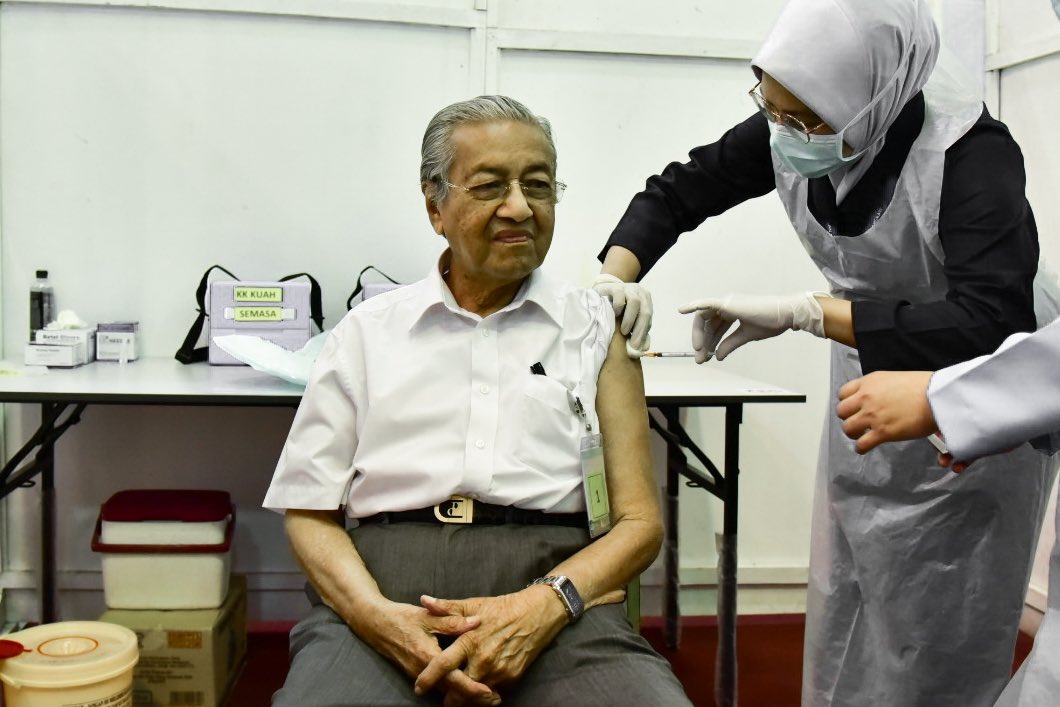 当地时间7日,马来西亚前总理马哈蒂尔在兰卡威接种新冠疫苗,95岁高龄的马哈蒂尔成为该国最年长的疫苗接种者。他在个人社交平台分享了接种疫苗的心情,他表示,接种后没有任何不适,并呼吁与他同样的年长者、以及年轻人积极接种新冠疫苗。