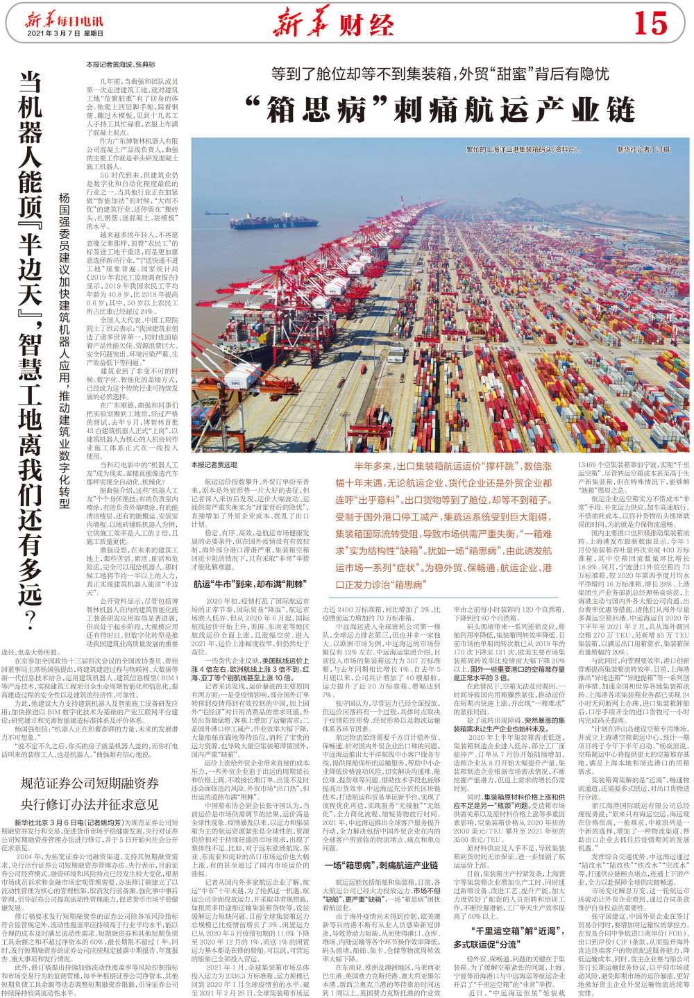 国内主要港口也积极推动集装箱流转。上海港发布最新数据显示,今年1月份集装箱吞吐量再次突破400万标准箱,其中空箱回流数量环比增长18.9%。同月,宁波进口外贸空箱约73万标准箱,较2020年第四季度月均水平净增约16万标准箱,增长28%。上港集团生产业务部副总经理杨焱滨说,上海港主动与国内外各大船公司沟通,出台费率优惠等措施,请他们从海外尽量多调运空箱回港。中远海运自2020年下半年至2021年2月,共从海外调回空箱270万TEU,另新增85万TEU集装箱,以满足出口用箱需求,集装箱保有量增幅约20%。