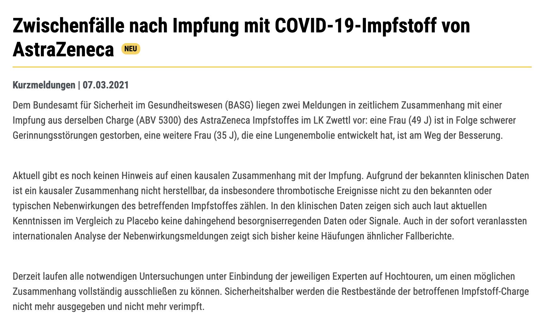 当地时间3月7日,奥地利联邦卫生安全部门在其官网指出,收到下奥地利州茨韦特尔地区同一批阿斯利康新冠疫苗中两份与疫苗接种相关的临时报告。报告称,接种该批次疫苗后一名49岁女性因严重凝血功能障碍而死亡;另一名35岁女性出现肺栓塞,目前在康复中。