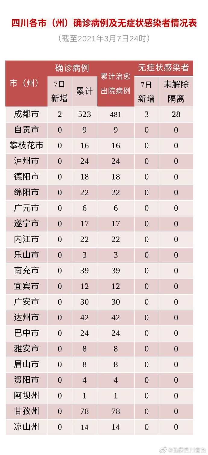 3月7日0—24时,四川新增新型冠状病毒肺炎确诊病例2例(均为境外输入,1例为2月18日自阿尔及利亚乘机抵蓉,3月7日确诊;1例为3月6日无症状感染者转确诊),无新增治愈出院病例,无新增疑似病例,无新增死亡病例。
