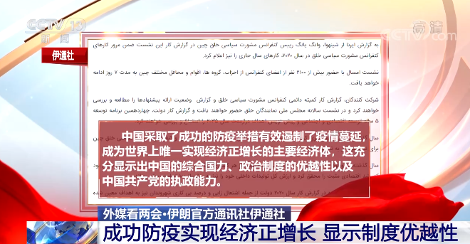 伊朗官方通讯社伊通社援引中国媒体报道关注两会进程。文章提到,中国采取了成功的防疫举措有效遏制了疫情蔓延,成为世界上唯一实现经济正增长的主要经济体,这充分显示出中国的综合国力、政治制度的优越性以及中国共产党的执政能力。