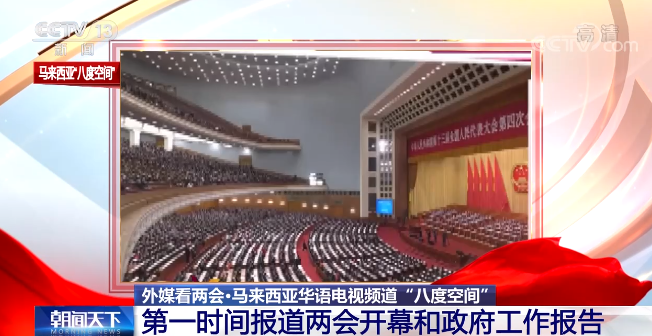 马来西亚华语电视频道“八度空间”在午间新闻栏目中以“备受瞩目的中国两会召开”开篇,第一时间报道了中国两会开幕和政府工作报告的要点内容,包括中国2021年国内生产总值增长的目标等。