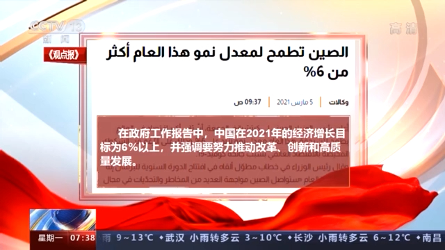 阿联酋知名阿拉伯语报纸《观点报》关注了中国为2021年设定的经济增长目标。报道称,在政府工作报告中,中国在2021年的经济增长目标为6%以上,并强调要努力推动改革、创新和高质量发展。