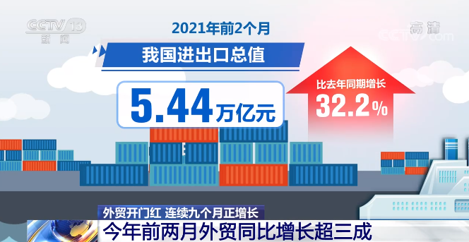 央视网消息:昨天(7日)上午,海关总署公布了今年前两个月外贸进出口相关情况。数据显示,前两个月我国进出口总值5.44万亿元,比去年同期增长32.2%,进出口继续保持向好势头。