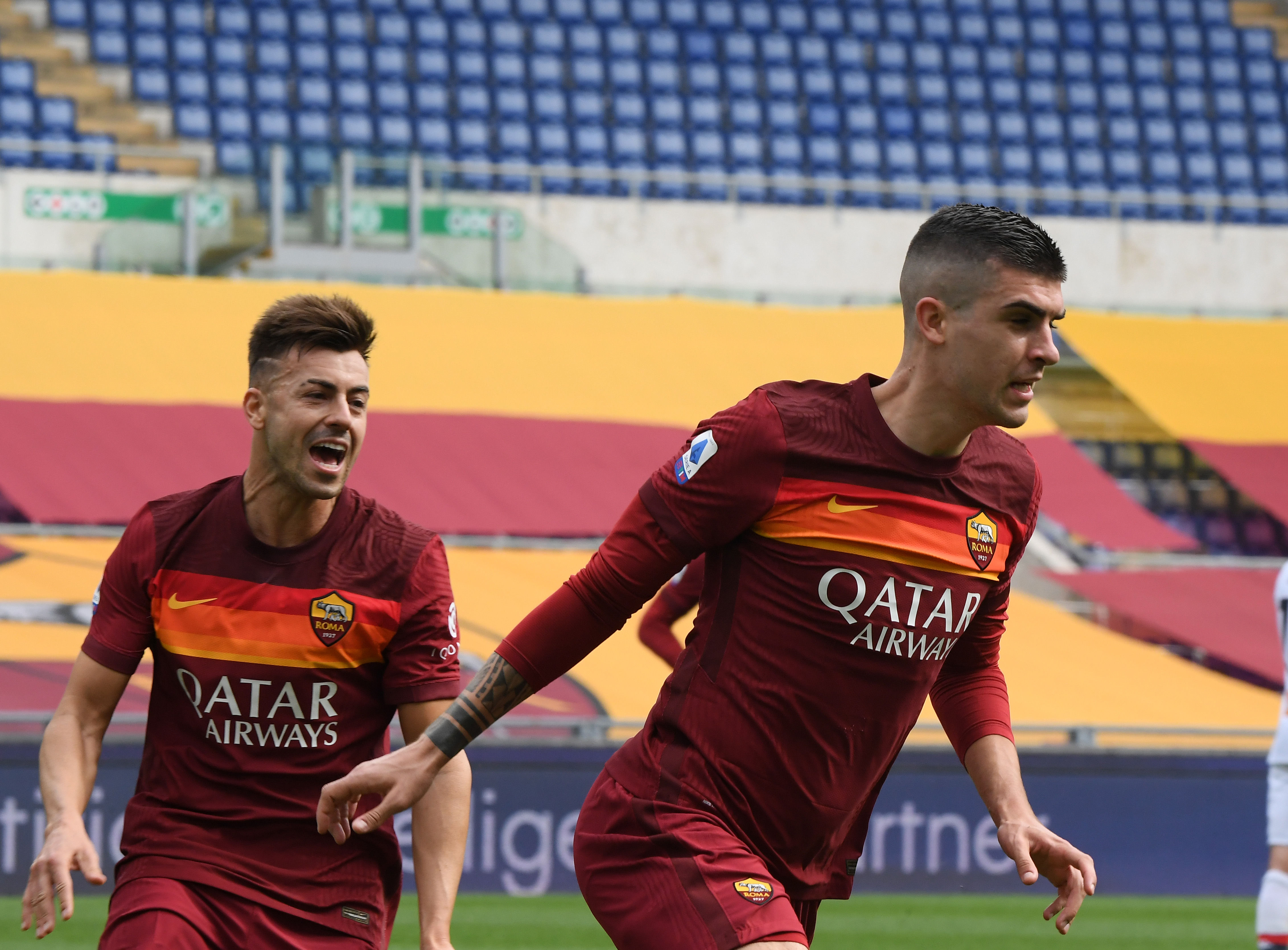 3月7日,罗马队球员曼奇尼(右)庆祝进球。新华社发(阿尔贝托·林格利亚 摄)