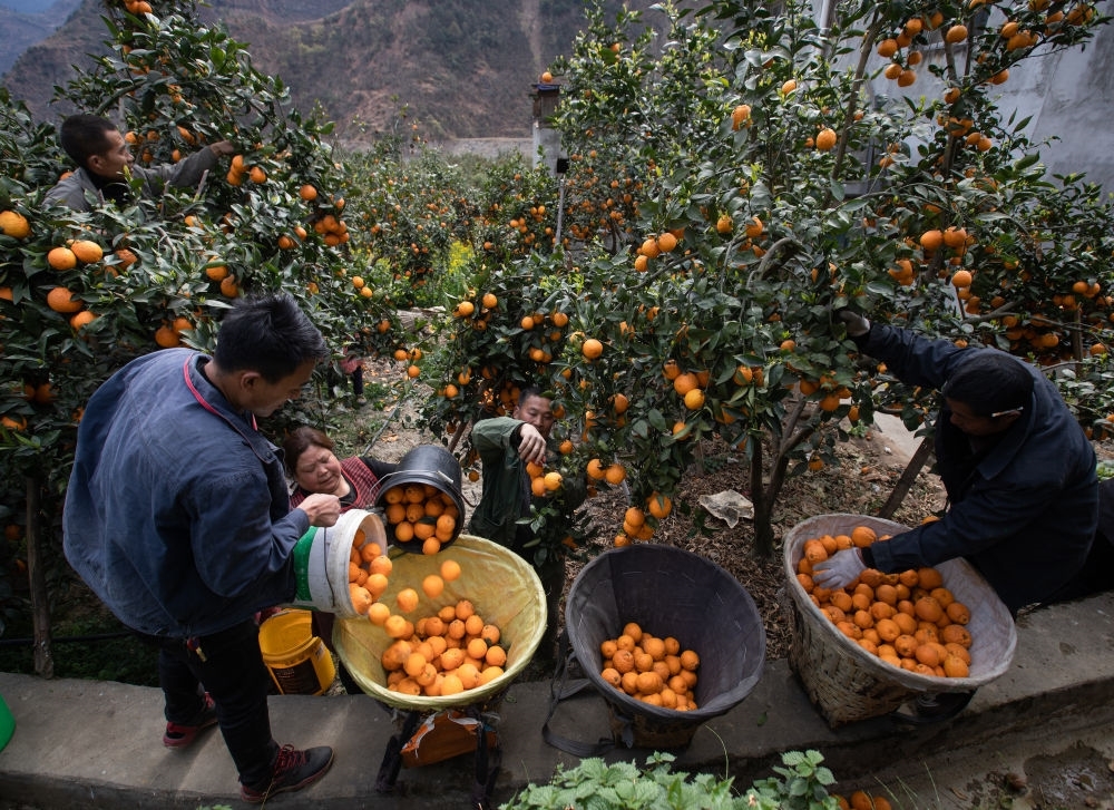 3月5日,在石棉县美罗镇坪阳村,果农在采摘黄果柑。