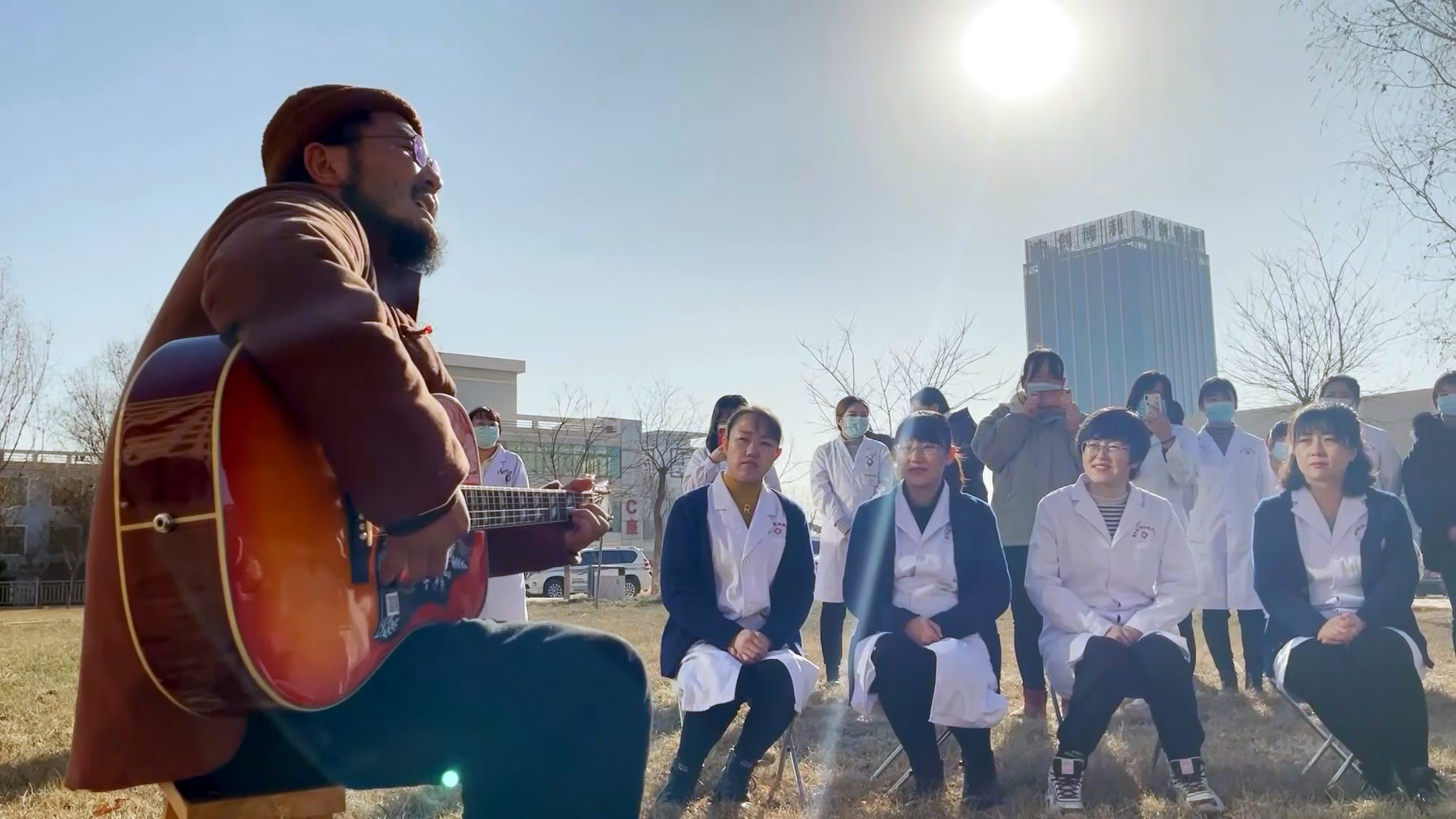 在白银市中西医结合医院的草坪上,身着红棉袄、黑棉裤,手拿一把吉他,张尕怂一入场,就迎来了20多名医护人员代表的热烈掌声。他时而高亢嘹亮、时而委婉低吟的嗓音在空中回响,张荣霞等医护人员还会跟着节拍一起哼唱。