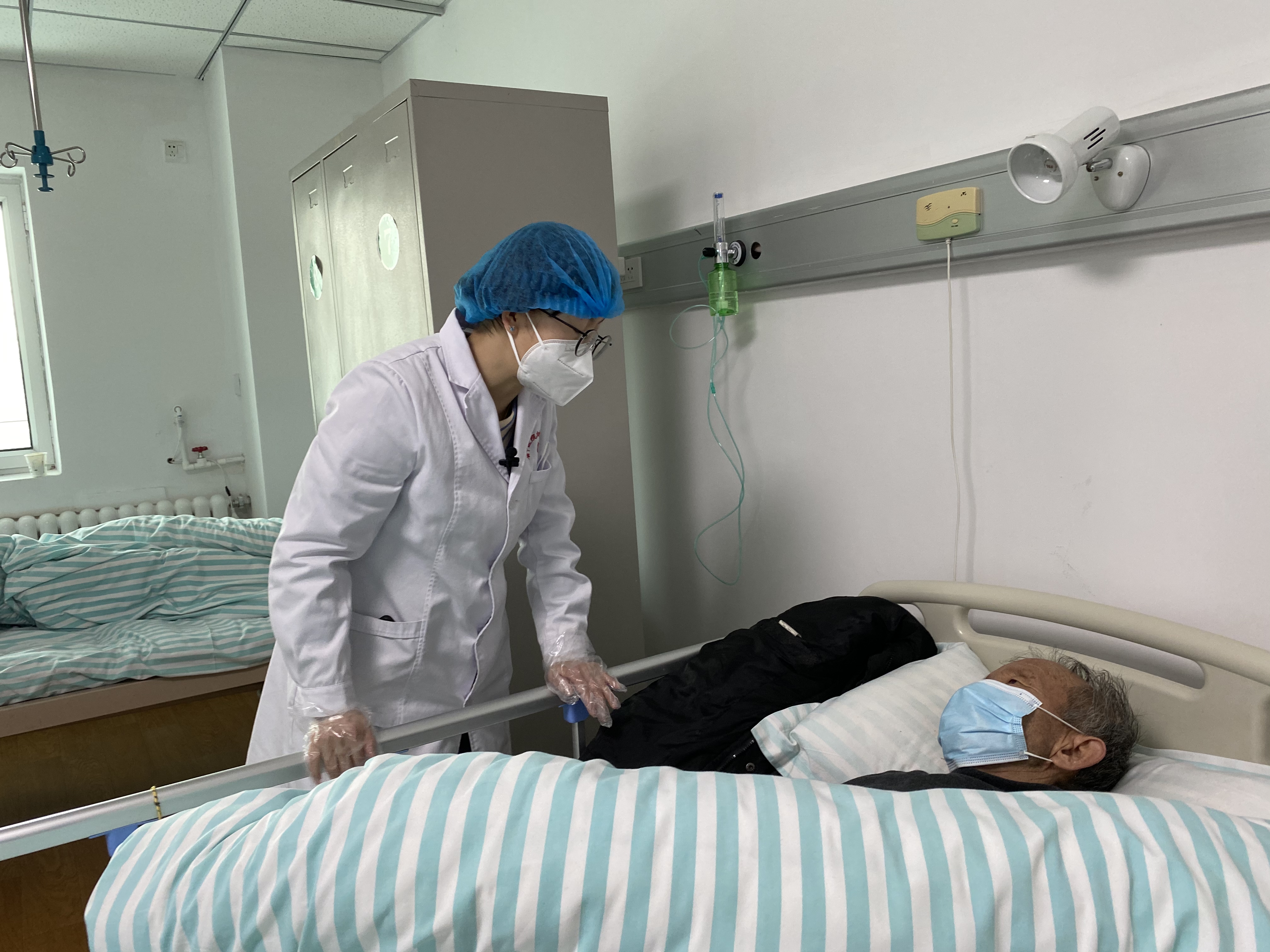 张荣霞(左)在白银市中西医结合医院感染科与住院患者交流(新华社记者 程楠摄)
