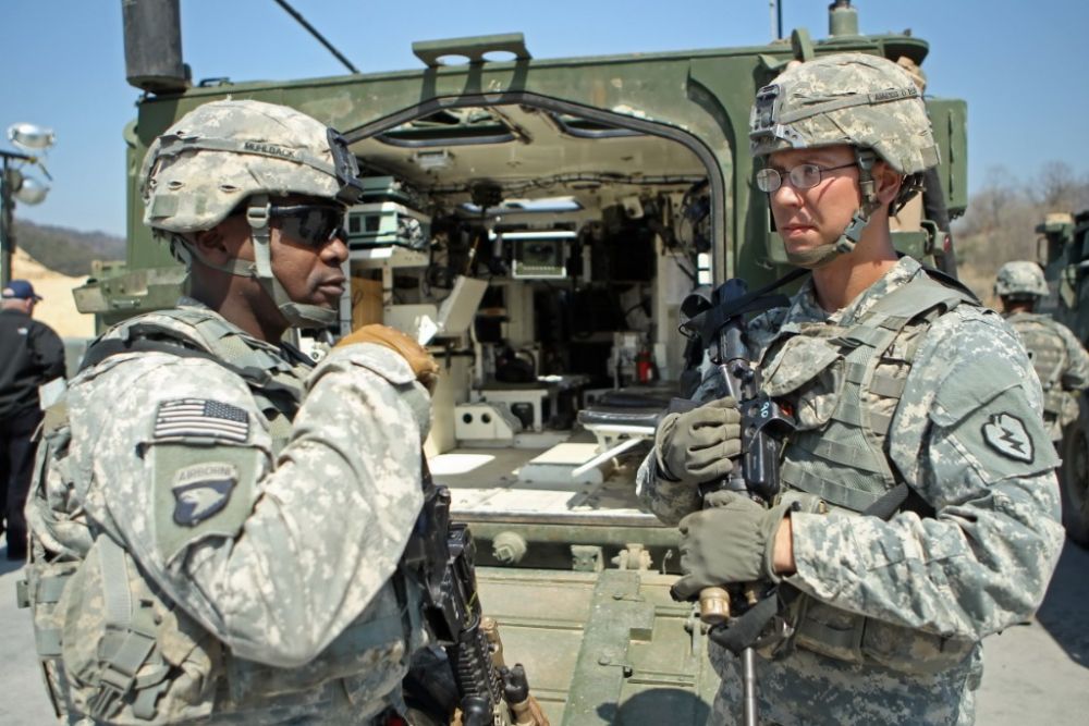 2015年3月25日,在韩国京畿道抱川,驻韩美军士兵在演习中。(新华社发,姜惺彬摄)