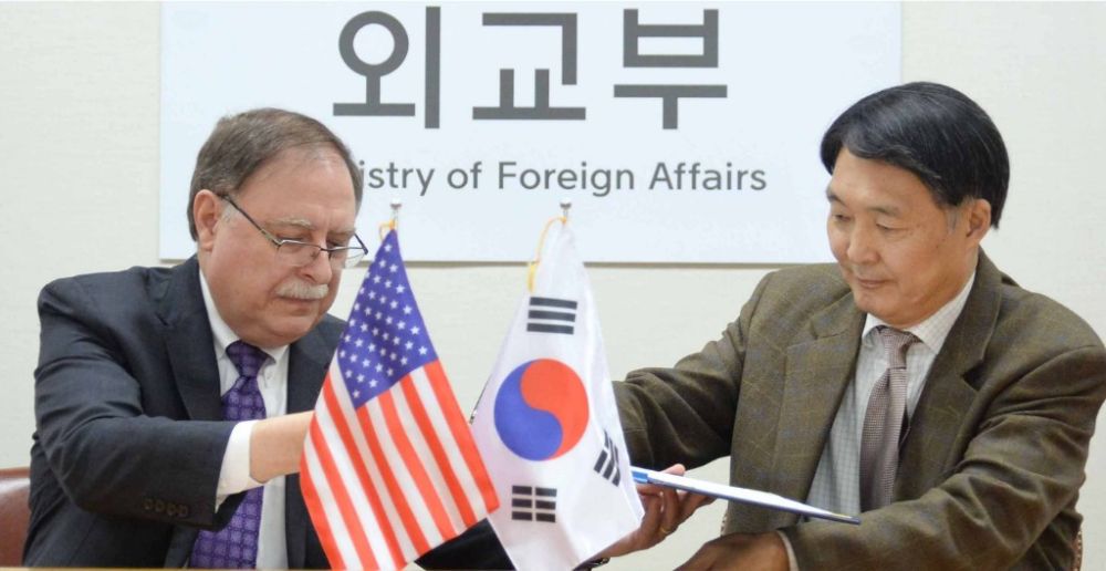 2019年2月10日,韩国外交部韩美防卫费分担谈判代表张元三(右)和美方谈判代表蒂莫西·贝茨在韩国首尔的外交部大楼签署协定。新华社发