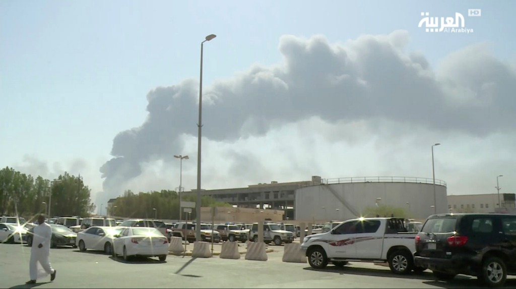 这张沙特的阿拉伯卫视台2019年9月14日的视频截图显示,位于沙特布盖格的阿美石油公司石油设施当天起火后冒出浓烟。也门胡塞武装证实,当天清晨动用无人驾驶飞机袭击了沙特境内一家炼油厂和一座油田。(新华社/美联)