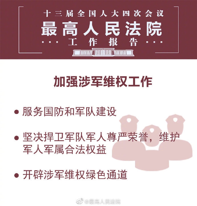 传承红色基因,服务国防和军队建设。严惩破坏军事设施、破坏军婚犯罪,坚决捍卫军队军人尊严荣誉,维护军人军属合法权益。继续做好涉军停偿下篇文章司法服务工作。开辟涉军维权绿色通道,让西藏戍边战士和家人先行拿到赔偿款,为边防战士提供后方坚强的司法保障。