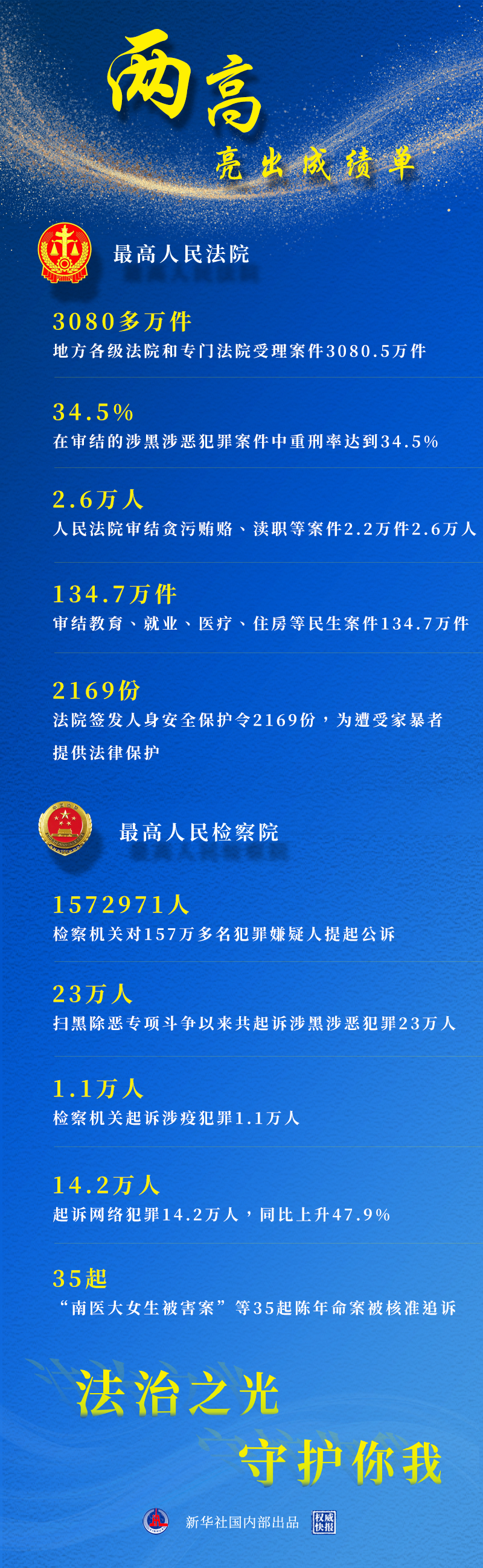 过去一年,你有多少法治“小确幸”?审结贪污贿赂、渎职等案件2.2万件,受理审查起诉严重暴力犯罪案件近20年最低,严惩“百香果女孩”案等涉未成年人犯罪,阐释“正当防卫”规则维护公序良俗……法治之光守护你我,一起来看,2021年的两高报告“成绩单”!