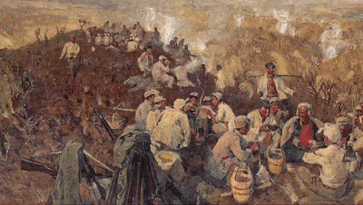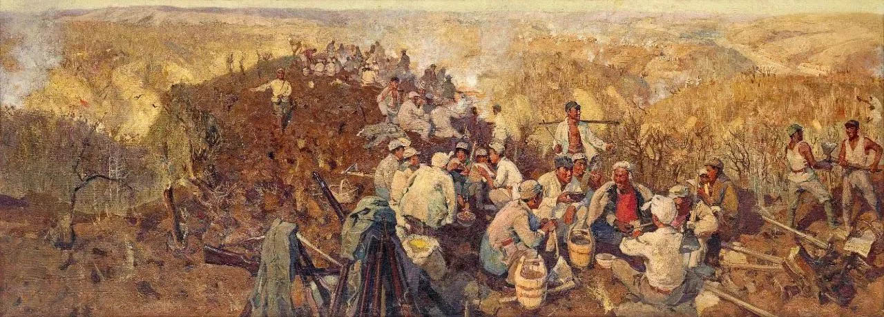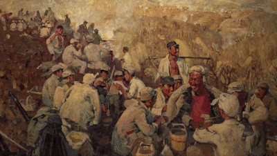 《南泥湾》由多组画面构成,结合了生产战斗和学习。通过俯视,把近景的劳动和远景的黄土高原结合起来,既有宏观场景,又有局部刻画。