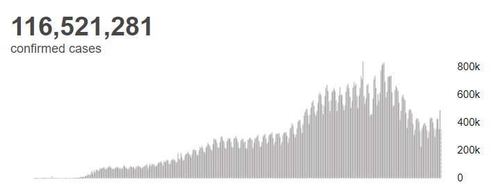 根据世卫组织最新实时统计数据,截至欧洲中部时间3月8日18时02分(北京时间3月9日1时02分),全球累计新冠肺炎确诊病例116521281例,累计死亡病例2589548例。8日全球新冠肺炎确诊病例新增354629例,死亡病例新增7020例。