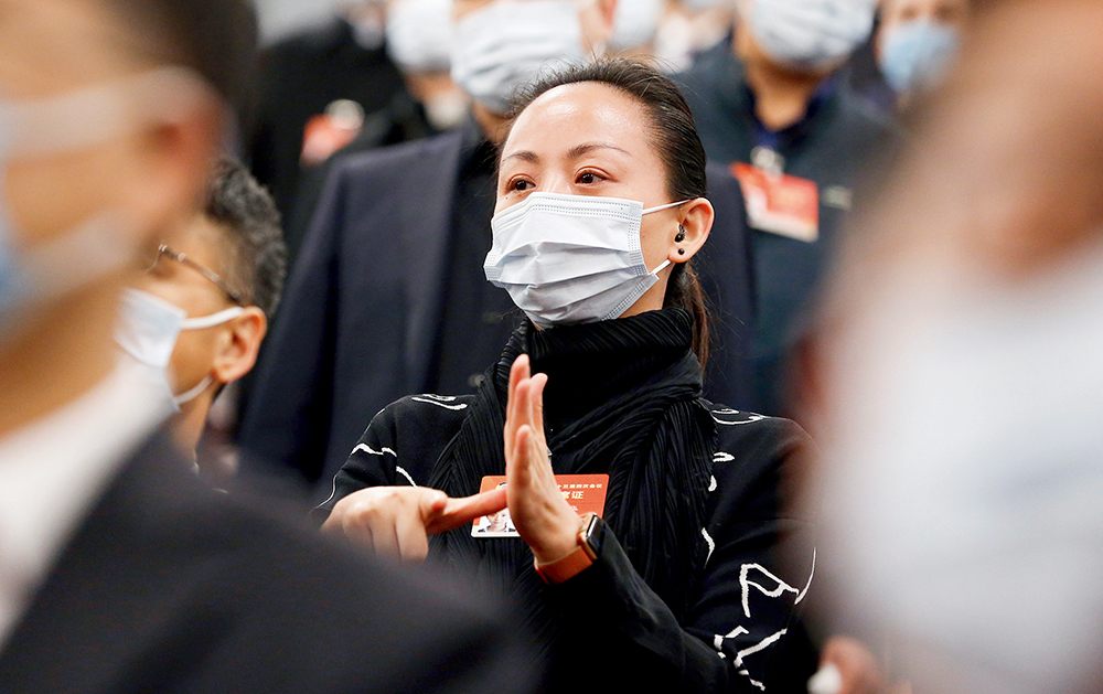 3月5日,第十三届全国人民代表大会第四次会议在北京人民大会堂开幕。这是列席大会的全国政协委员、中国残疾人艺术团团长邰丽华用手语“唱”国歌 张玉薇摄/本刊